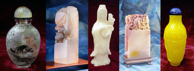 Here you can find photos of our selected collections in Shoushan stones, snuff bottles, antiques, and other ornamental goods. Come visit our showroom to see our full display or contact us for more information.